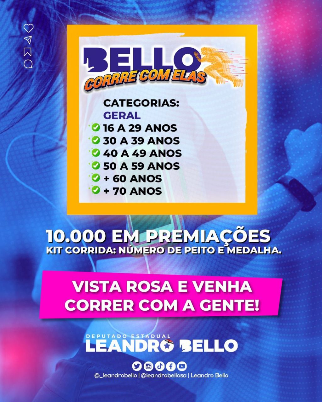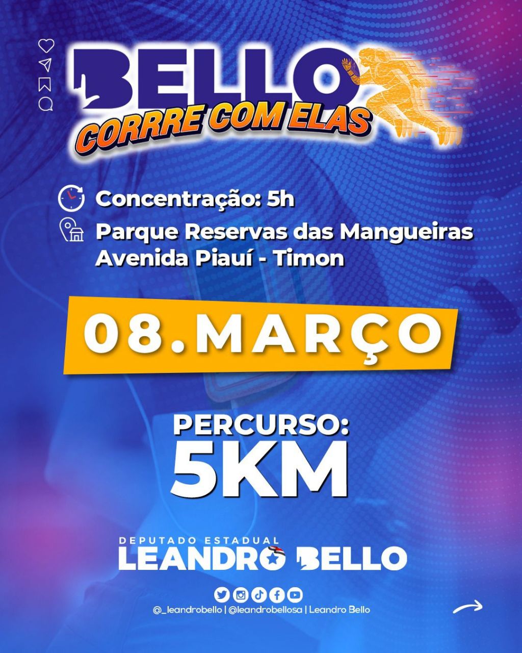 No próximo dia 8 de março, data em que se celebra o Dia Internacional da Mulher, a cidade de Timon será palco de um evento que une esporte, saúde e solidariedade. A corrida "Bello Corre com Elas", promovida pelo deputado estadual Leandro Bello, promete mobilizar participantes de diversas idades em um percurso de 5 quilômetros voltado especialmente à valorização feminina.